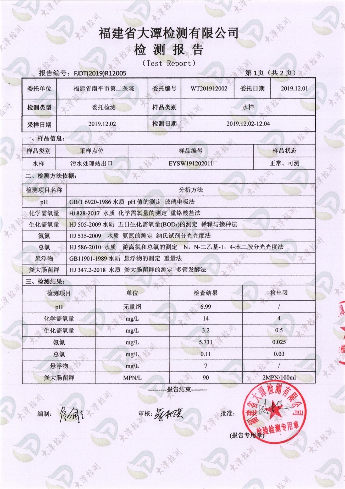 南平市第二醫(yī)院污水排放檢測報告及檢測機構(gòu)資質(zhì)認定書